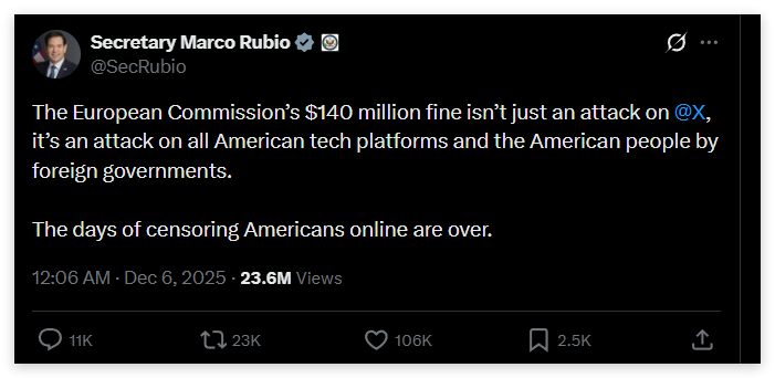 鲁比奥宣称欧盟的处罚行为是对美国所有科技平台和美国人民发动的“攻击”